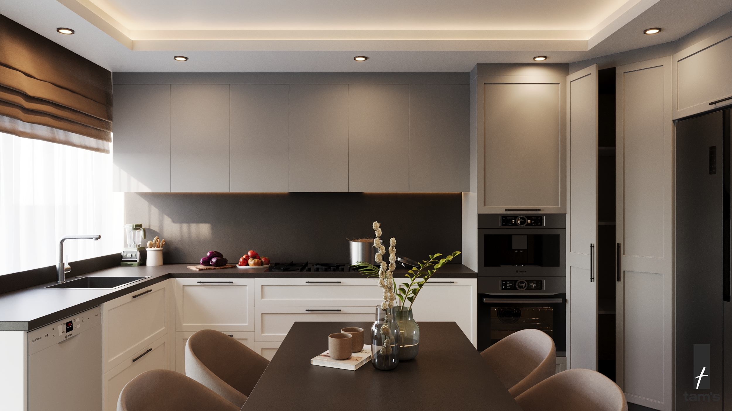 İç mimari proje, özellikle salon ve mutfak bölümlerinde benimsenen açık plan ile dikkat çekiyor. Mutfak adası, hem yemek hazırlama hem de sosyal etkileşim alanı olarak öne çıkıyor. Ferahlık ve açıklık hissi, büyük pencereler ve sade mobilya seçimiyle pekiştirilmiş; işlevsel, ergonomik ve zarif bir atmosfer oluşturulmuş. Bu uyum, gündelik hayatın hem çağdaş hem sıcak bir ortamda akmasını sağlıyor.