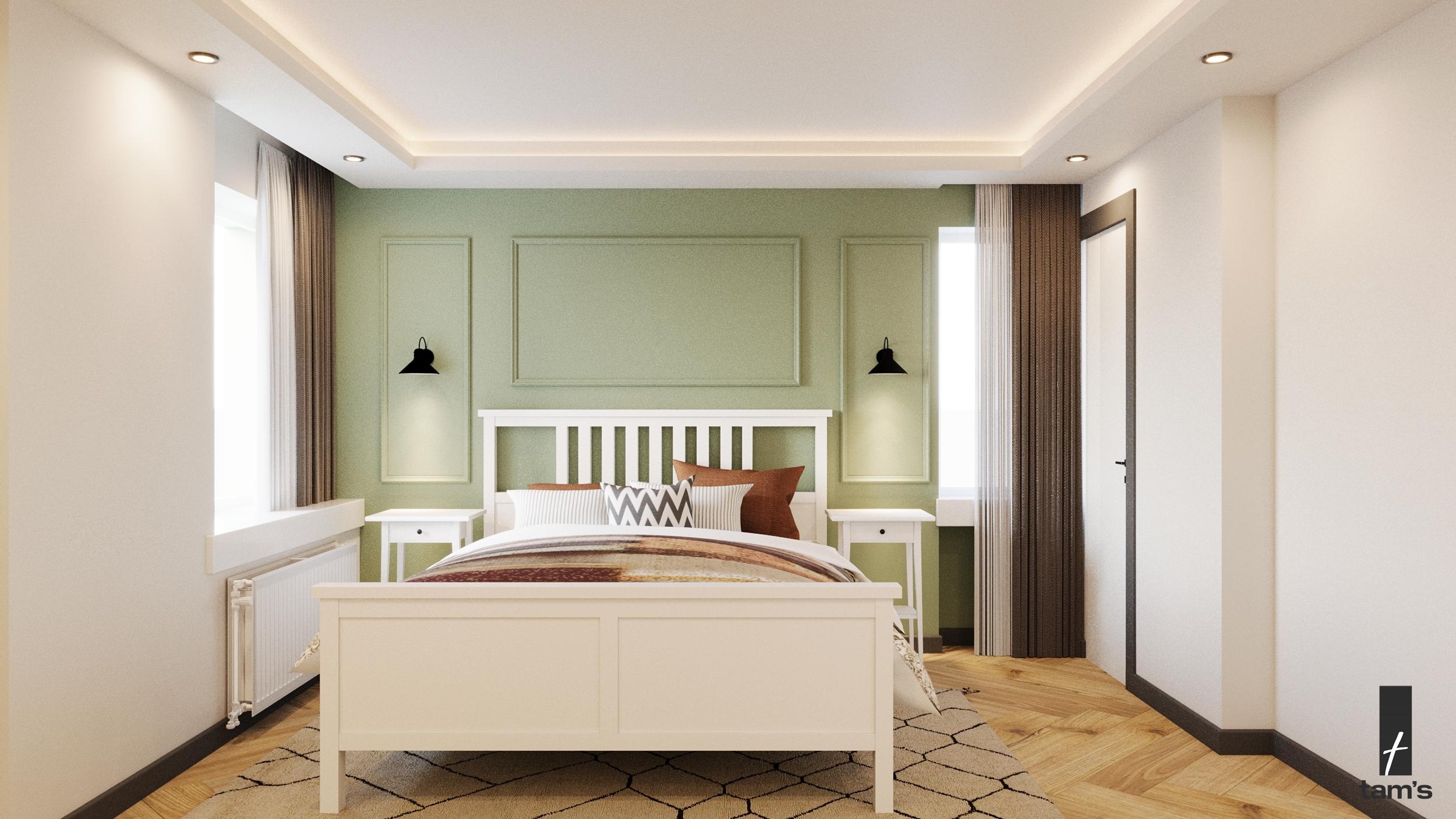 Yatak odası, sakin bir dinlenme alanı olarak konumlandırılmış; nötr ve pastel tonlarla kaplanmış duvarlar, geniş depolama çözümleriyle desteklenmiş. Başta gömme dolap sistemleri olmak üzere, her bir detay dolaylı aydınlatma ve raf sistemleriyle işlevselliği ön plana çıkartıyor. Bu sayede hem estetik hem de düzenli bir ortam yaratılmış.