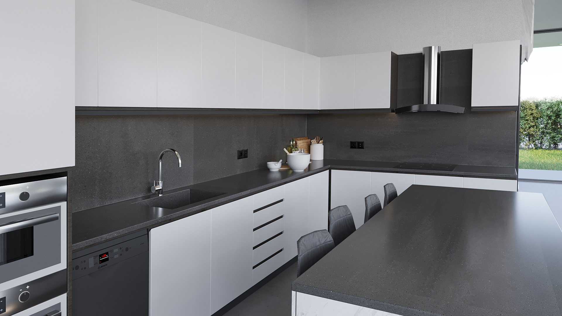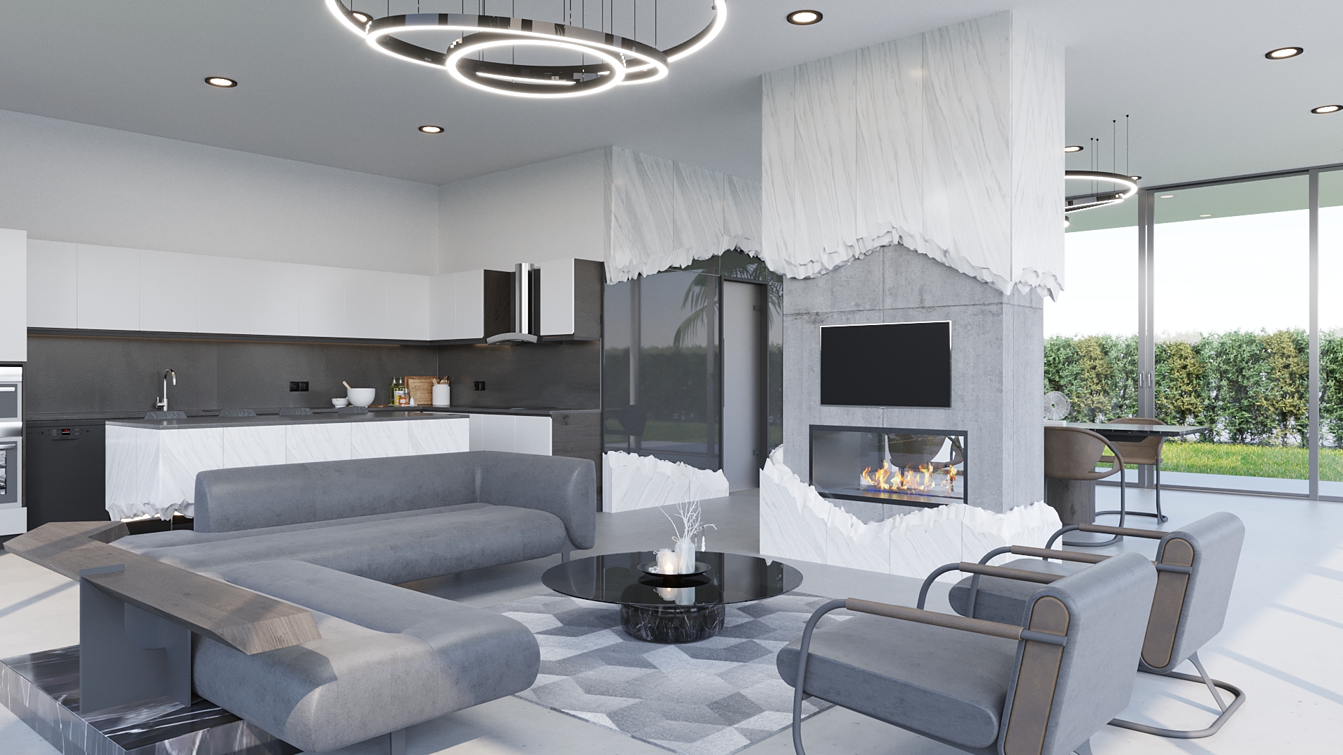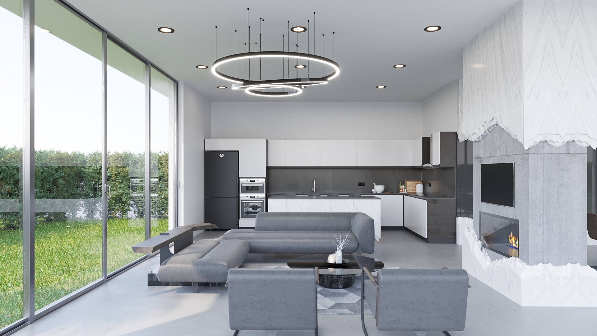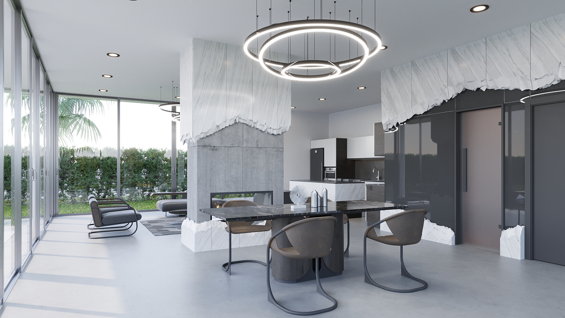 Projenin en dikkat çekici özelliklerinden biri, yapının üç tarafının camla çevrili olmasıdır. Bu tasarım, mekanın doğal ışıkla dolmasını sağlamakla kalmaz, aynı zamanda iç mekan ile dış mekan arasındaki geçişi kolaylaştırır. Cam cepheler, bahçe ve doğa ile bütünleşen yarı açık bir alan oluşturur. İstenildiğinde tamamen açılarak dış mekân havası yaratılması, kullanıcılara dört mevsim keyifli bir kullanım deneyimi sunar. Böylece Grandijr, yatay mimarinin en güzel örneklerinden biri olarak öne çıkar.