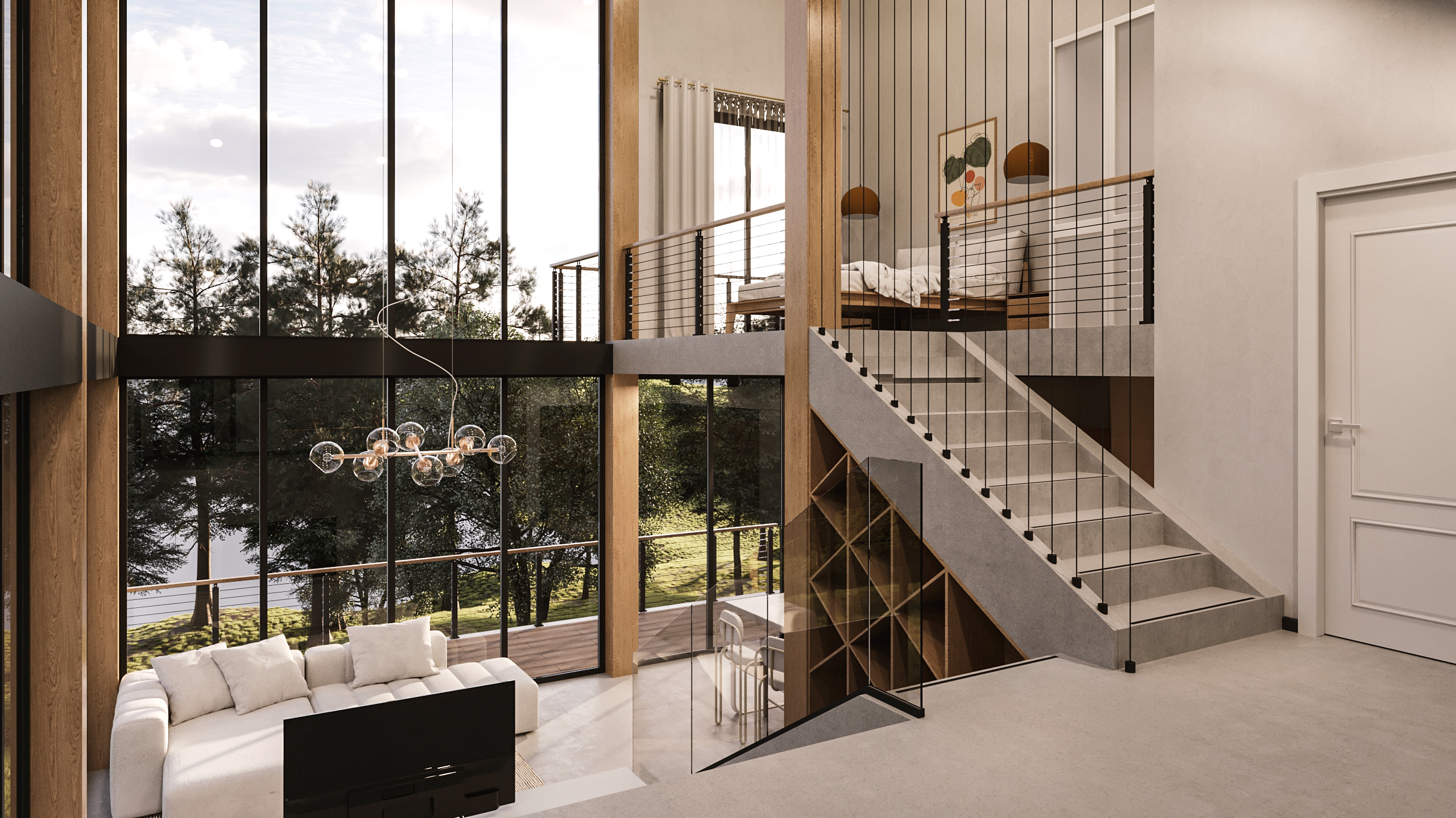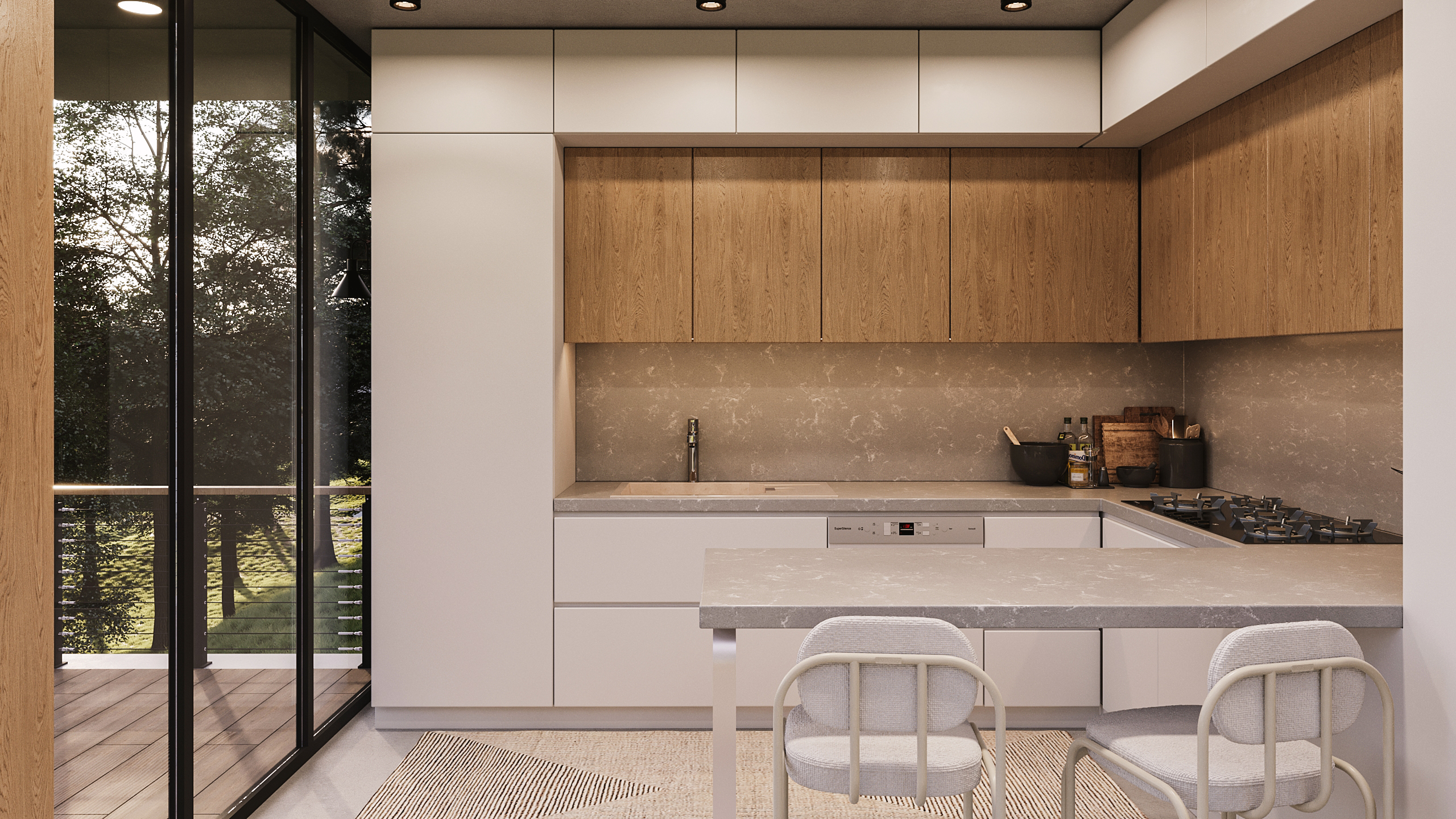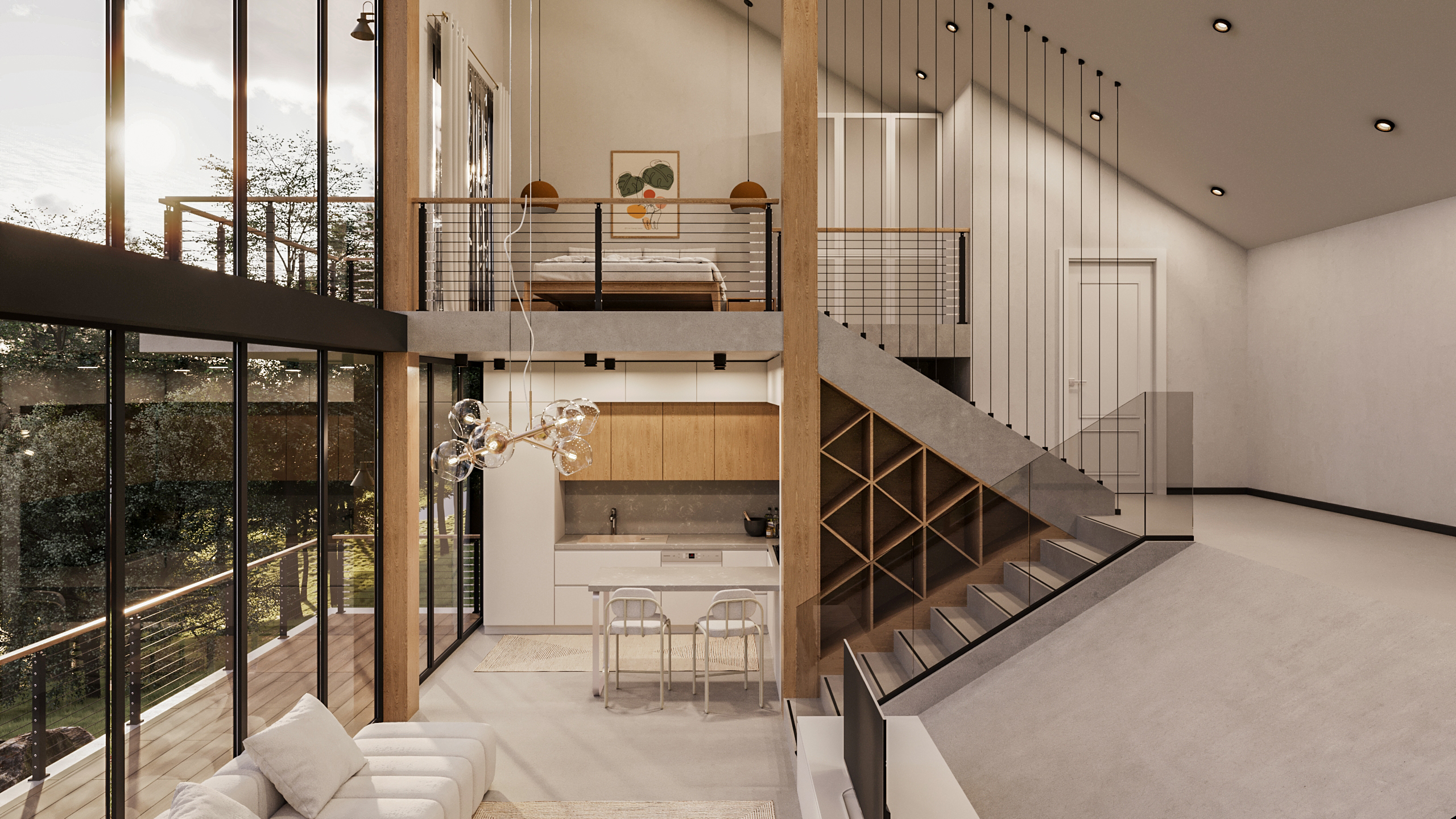 Home at Cliff, tipik bir tiny house’un tüm temel özelliklerini taşırken, yerel malzemeler ve modern çizgilerle zenginleştirilmiş. Dış cephede önerilen doğal ahşap kaplama, hem çevreye uyum sağlıyor hem de yapı ile doğa arasında görsel bir bütünlük kuruyor. İç mekânda ise açık plan yaklaşımı benimsendi. Alanların birbirine akıcı bir şekilde bağlandığı bu kurgu, küçük hacmi olduğundan daha geniş hissettirmeyi amaçlıyor. Loft tipi yatak alanı ve alt kotta konumlanan mutfak-yaşam bölümü, fonksiyonelliği ön planda tutan çözümlerle geliştirildi.